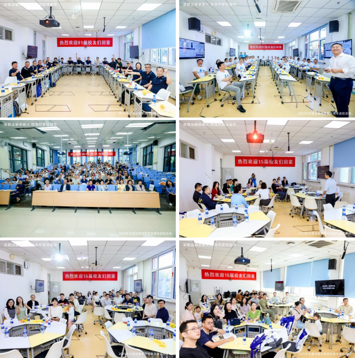 学校值年校友返校大会落幕后,85届、95届、05届、15届校友们前往熟悉的第八教学楼和思源108教室,参加运输学院校友值年返校庆祝大会。为让不同届次的校友皆能畅叙心声、共话当年,学院设置六个分会场同步开展活动。